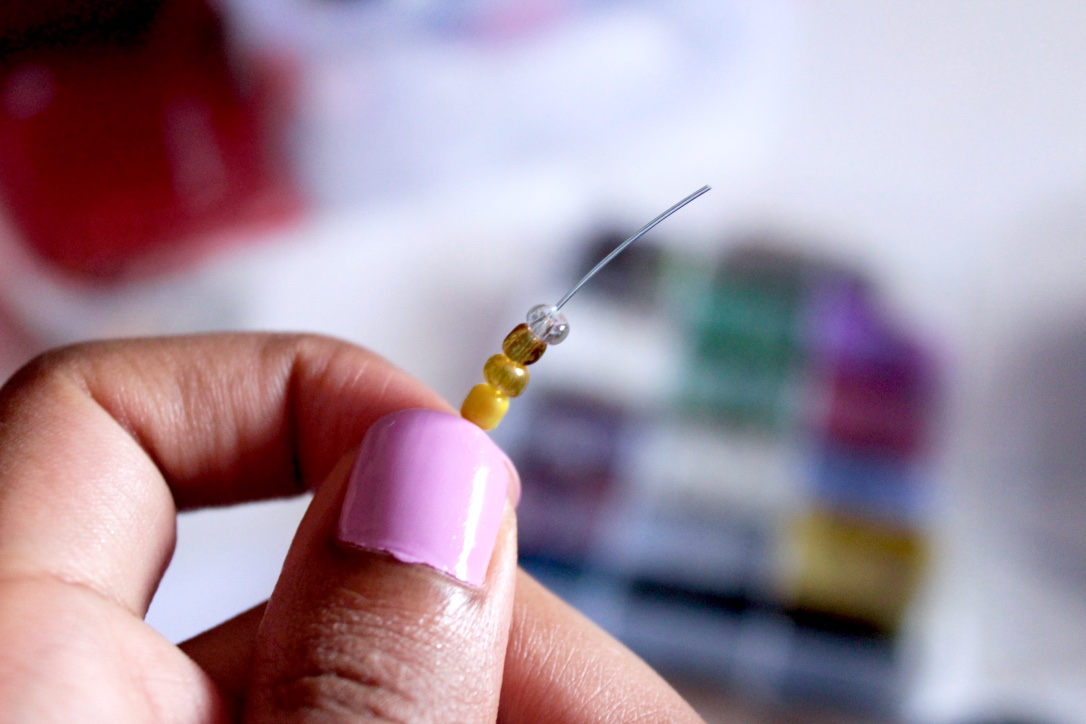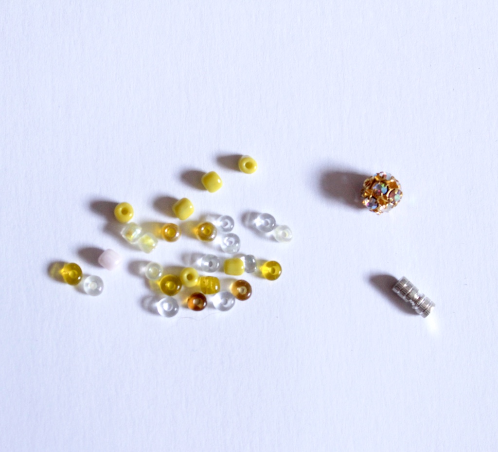 So for those who are not afraid of crafts here is a more complex option using a fishing string. Begin by putting the closure. I got the one seen below which only needs a knot at each end but there are several types of closures that you can find according to your taste. After putting one of the closures I began inserting the beads. I didn’t follow any specific pattern; I only made sure of having the glittery one in the middle. After I was done I put the other closure at the end and voila! It is not hard but it requires patience.